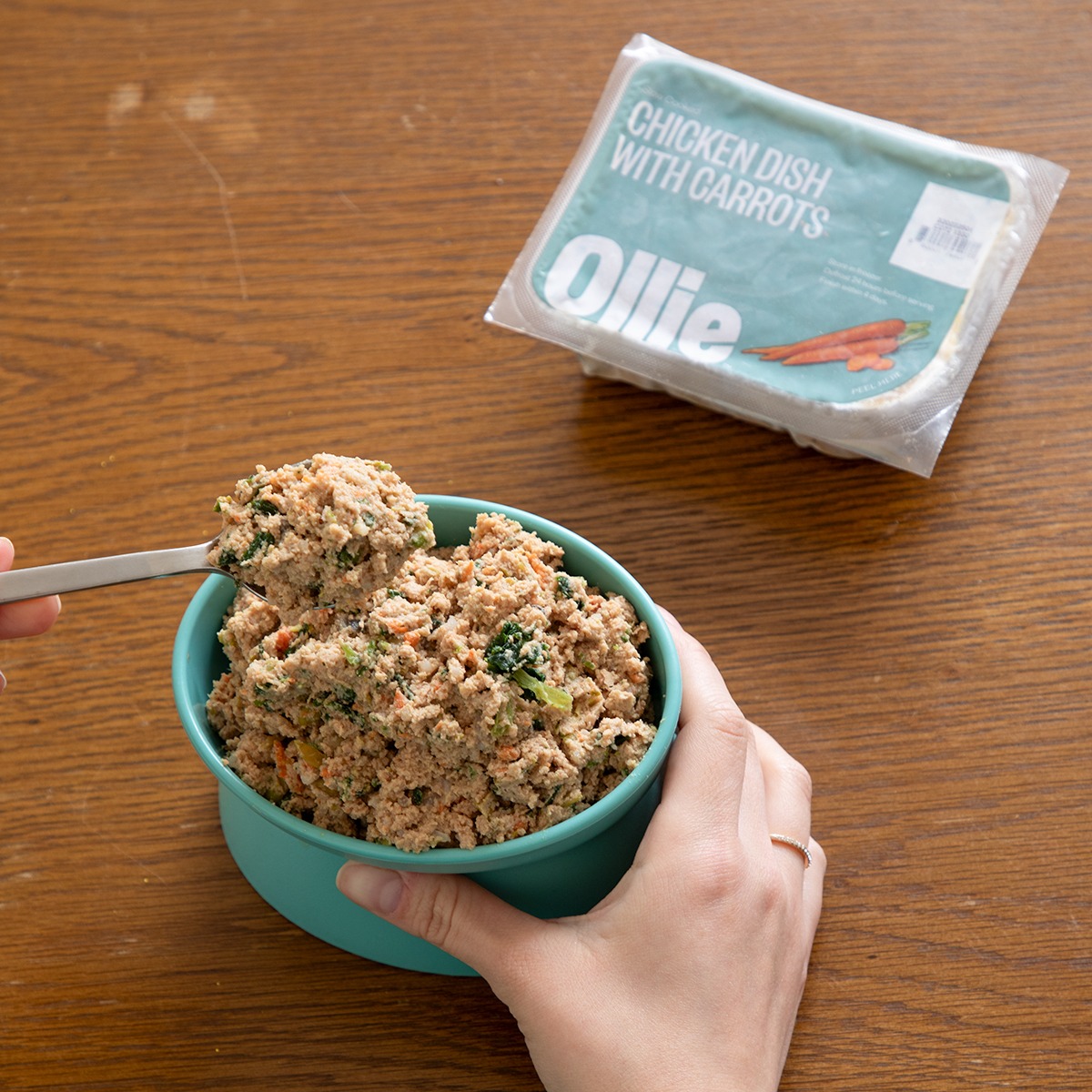 Max’s favorite Ollie meal is their fresh beef with sweet potatoes recipe. In this doggy dish, the sweet potatoes act as a slow‑burning carbohydrate and fiber source. Peas and chickpeas add protein, fiber, and vitamins. Carrots bring some insoluble fiber (which helps add bulk to stool and keeps the digestive tract moving). And Ollie’s fresh chicken and rice recipe is a great option for more sensitive stomachs (Max’s is a thing of the past now, thanks to Ollie!). Rice is ultra-digestible, while carrots, peas, spinach, and even cranberries are there to help with fiber, hydration, and texture.