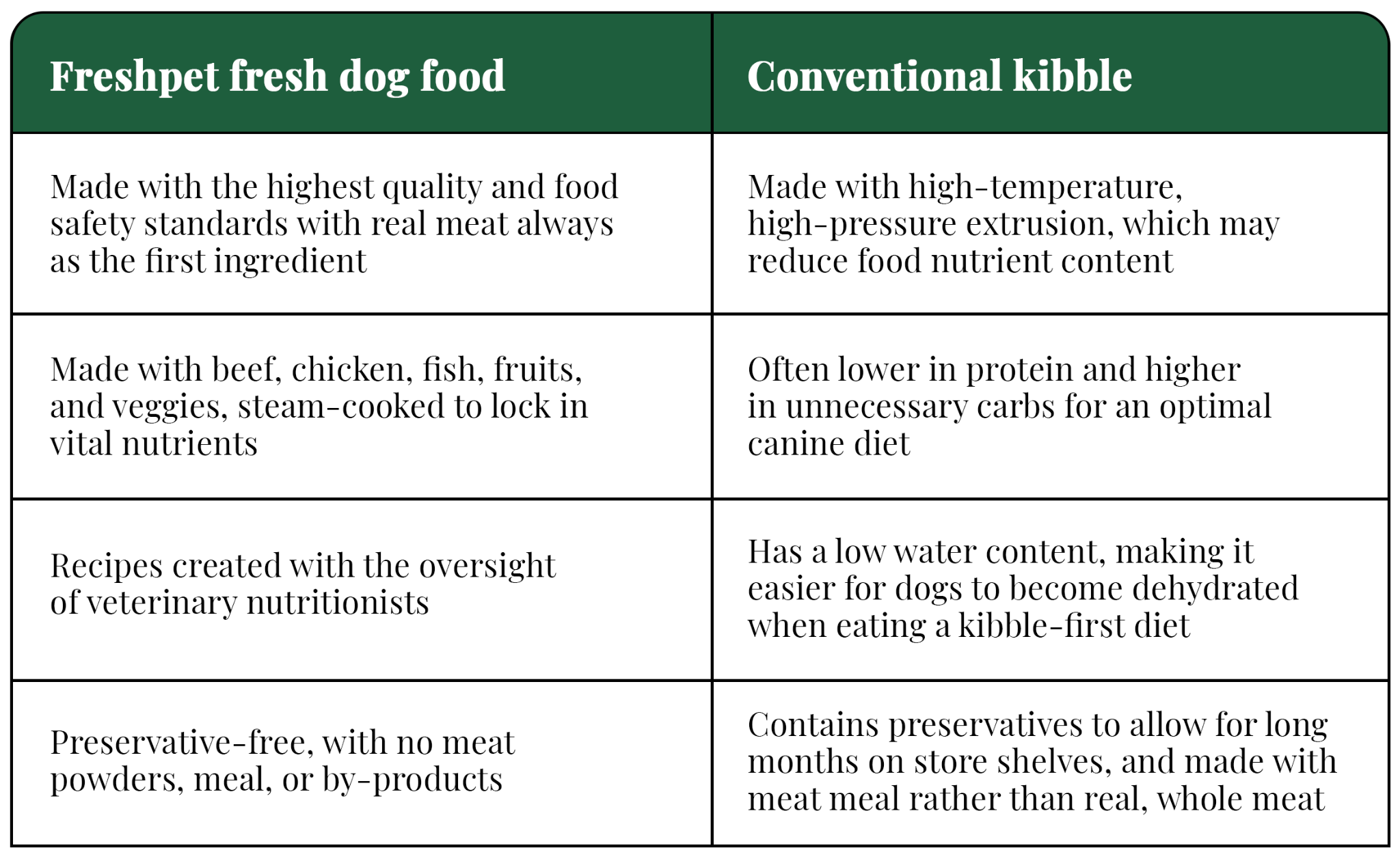 Shelf-stable conventional kibble was the default for feeding our pets for over 70 years. But now we know that its highly processed, high heat-extruded creation isn’t healthy for our dogs. Pet parents like me have started to turn away from lower quality kibble to food that more closely resembles what we’d eat, with real meats, fruits, and vegetables you can see.